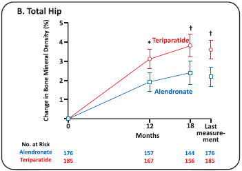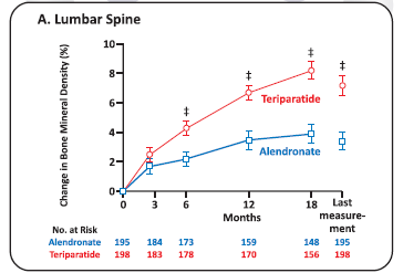 - Methods: In an 18-month randomized, double-blind, controlled trial, we compared Teriparatide with Alendronate in 428 women and men with Osteoporosis (ages, 22 to 89 years) who had received glucocorticoids for at least 3 months (prednisone equivalent, 5 mg daily or more). A total of 214 patients received 20 pg of Teriparatide once daily, and 214 received 10 mg of Alendronate once daily. The primary outcome was the change in bone mineral density at the lumbar spine. Secondary outcomes included changes in Bone Mineral Density at the total hip and in markers of bone turnover, the time to changes in Bone Mineral Density, the incidence of fractures and safety.