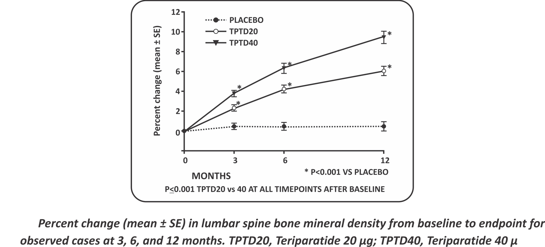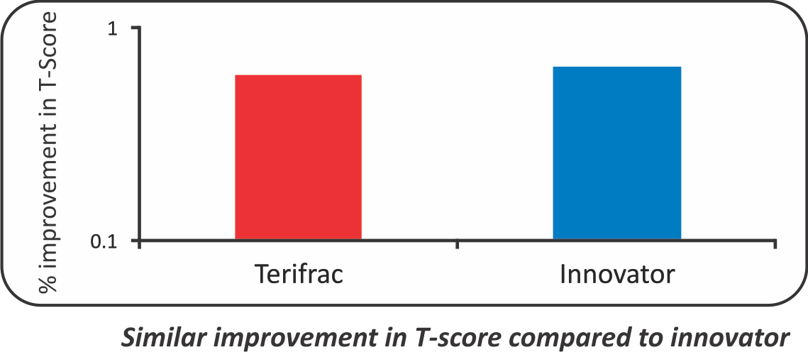 - After Treatment for 3 Months, the mean increase in BMD (L1-L4) values was 0.77 to 0.81 in Intas Teriparatide group and from 0.78 to 0.83 in forteo. (p value<0.05)