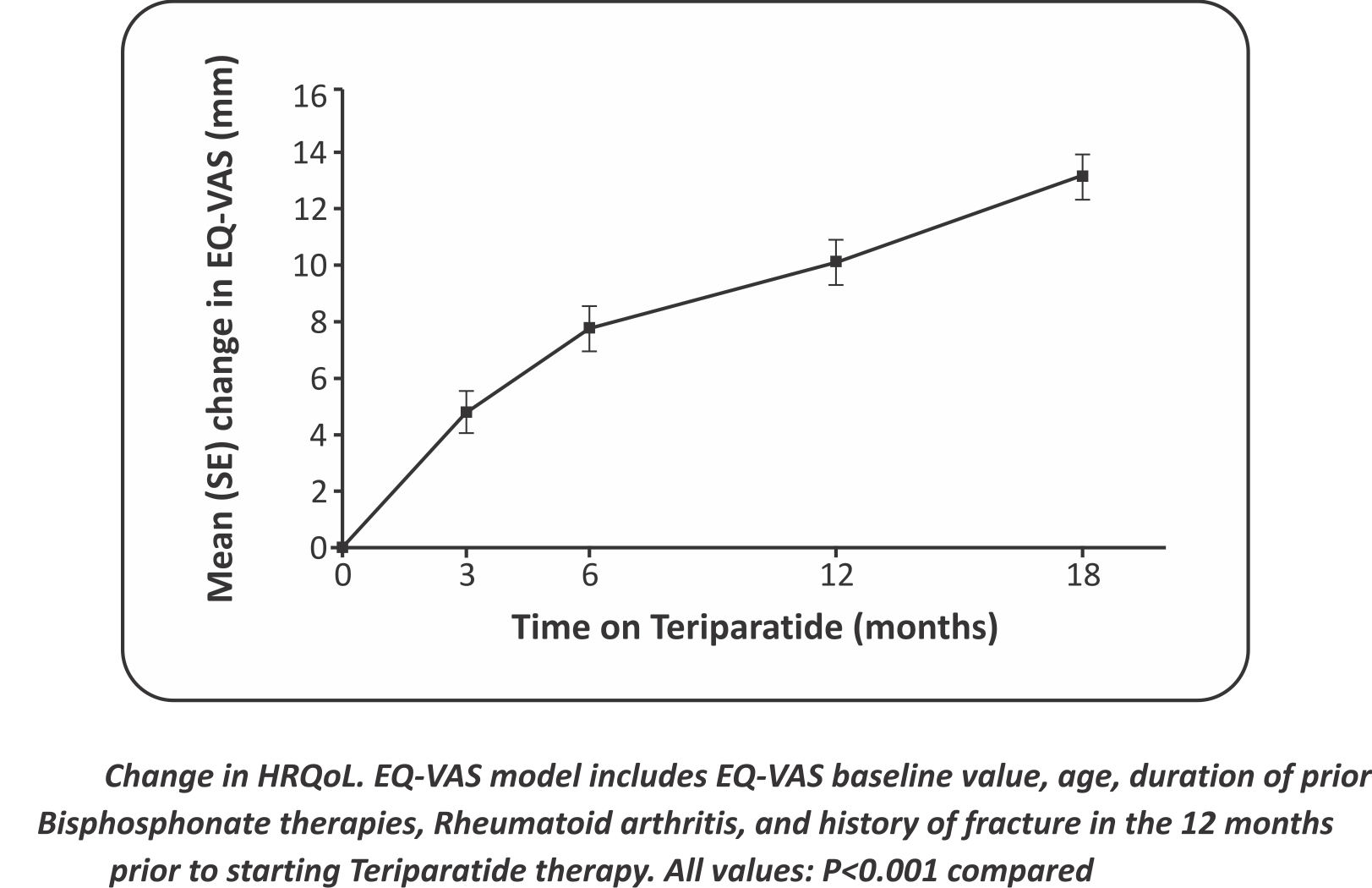 - Change in HRQoL. EQ-VAS model includes EQ-VAS baseline value, age, duration of prior Bisphosphonate therapies, Rheumatoid arthritis, and history offracture in the 12 months prior to starting Teriparatide therapy. All values: P<0.001 compared to baseline