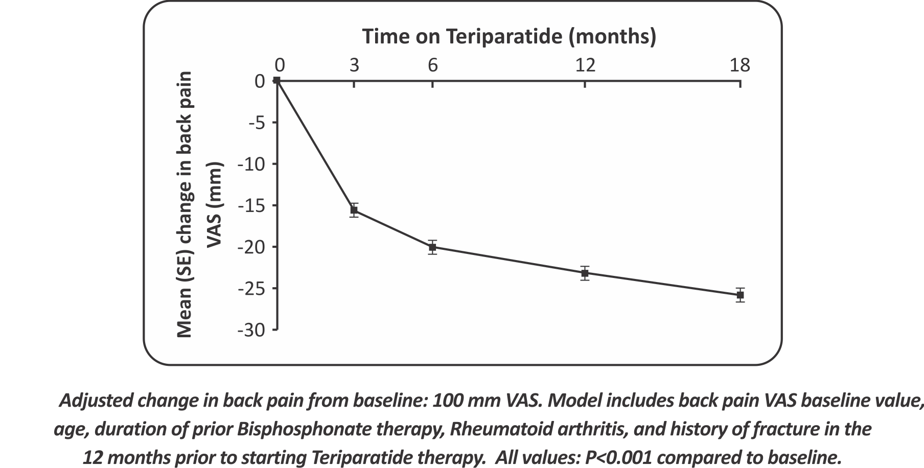 - Adjusted change in back pain from baseline: 100 mm VAS. Model includes back pain VAS baseline value, age, duration of prior Bisphosphonate therapy, Rheumatoid arthritis, and history of fracture in the 12 months prior to starting Teriparatide therapy. All values: P<0.001 compared to baseline.